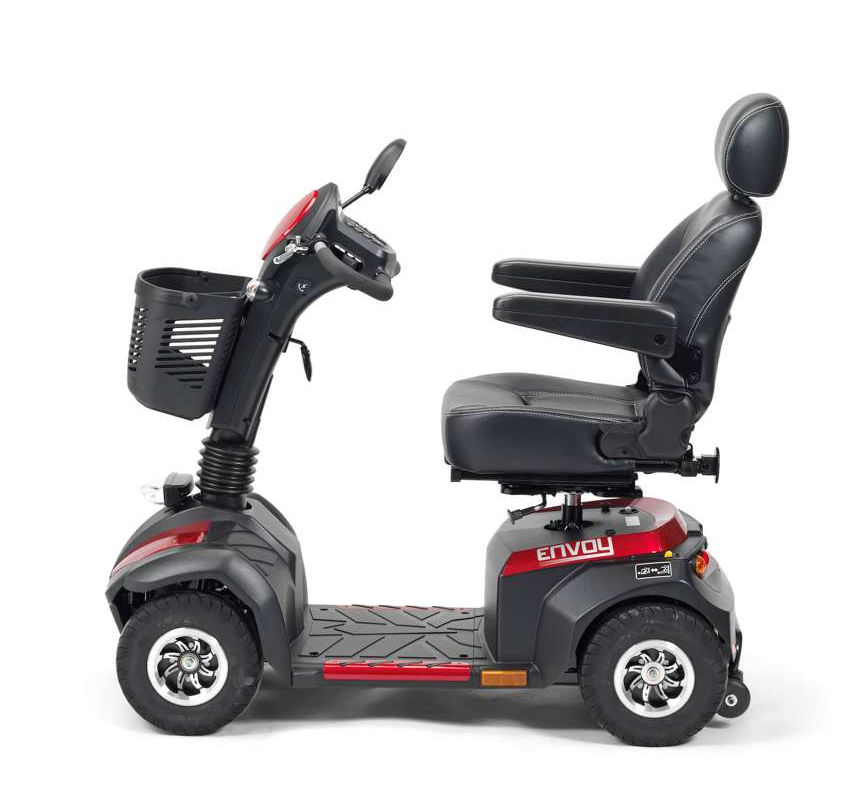 Key Features of the Drive Envoy mobility scooter are: Max range of 30 miles* » Top speed of 8mph* » Fully functioning indicators and mirror for road use » Powerful 500W motor » Secondary cable brake » Sport style seat » Modern dashboard design » Black pneumatic tyres with large 5” rims » Hydraulic tiller adjustment » Delta bars as standard » 50ah batteries